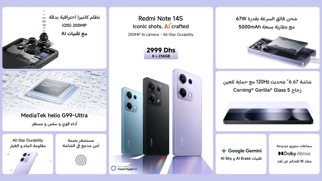 هاتف Redmi Note 14S من شاومي (Xiaomi)، وهو أحد الطرازات في سلسلة Redmi Note 14 التي تم إطلاقها مؤخرًا. إليك تفاصيل شاملة عن هاتف Redmi Note 14S: